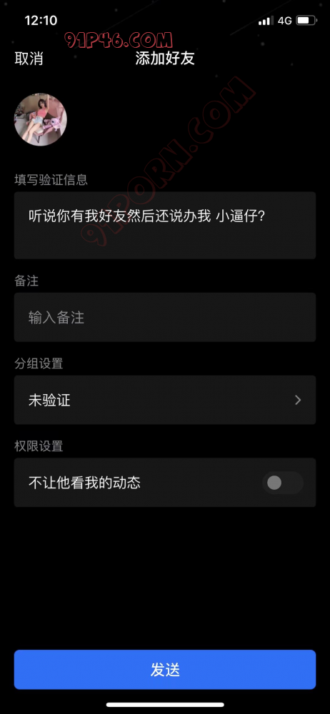 他这是大鱼撒网全国各地的人都加,然后让人拉到一个qq群里,卖假视频,骗着说低价卖91帖子(给一个钱T一个人,你骂他他用你验证照片威胁)。跟情侣夫妻私聊然后说开房见面直接转房费等等等等等