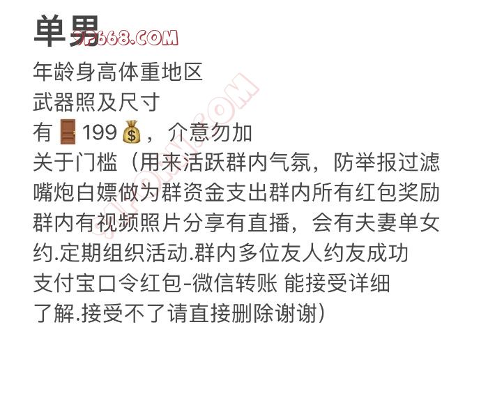 关于门槛:过滤嘴炮白嫖屌丝,作为群资金活跃气氛,群内视频照片分享直播,夫妻单女线下邀约,群内多位成员约友成功
