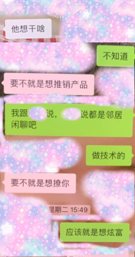 前端时间,我老婆被邻居加了微信然后就开始闲聊,我老婆告诉我,我故意说是邻居闲聊吧,然后她去找她闺蜜问,她闺蜜一眼都看出来还告诉她了,我老婆还装纯洁说对方想悬浮,你说我老婆和她闺蜜分别是怎么想的,目前已经聊了好几个月了